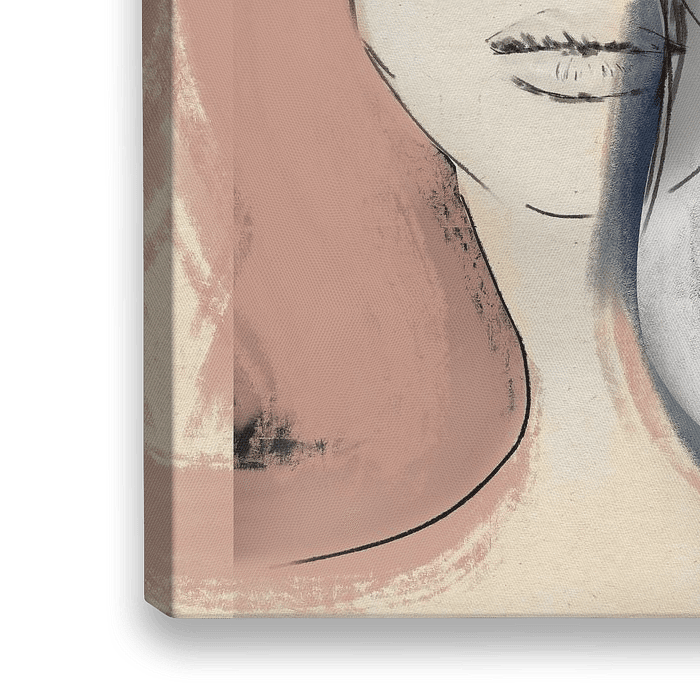 Een enorm modieus portret van een krachtige, stoere en prachtige vrouw. Het portret is eigentijds, speels, urban, stoer en modern. De stijl past binnen de mode illustraties. De combinatie van het zachte oud roze / nude in combinatie met het zwart en de blauwtinten geven dit portret een gewaagd en stoer karakter. Een digitaal schilderij met duidelijke kwaststroken en hier en daar een stencil achtige feel. Autentiek en hedendaags, Abstract en realistisch. Lieflijk en stoer. Contrastrijk en rustig. Het heeft het allemaal.