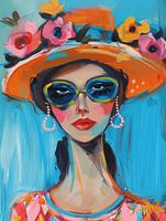 "Fashionista" kleurrijk, grappig portret in oranje, roze, geel en blauw van een uitbundig geklede vrouw met grote zonnebril en oorbellen. Illustratie.