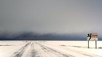De hoofdweg of ringweg nr. 1 in IJsland in de winter van 2014. Er was slecht weer op komst en de wegen waren al niet meer zo schoon. Terwijl wij even pauze hielden zag ik de donkere lucht in de richting van ons einddoel en het bord langs de weg. Van mijn IJslandse chauffeur begreep ik dat het bord een reclame was om vooral de gordel te dragen tijdens het rijden. En dat was met dit weer zeker geen overbodig advies. Dankzij de spijkerbanden zijn we 's avonds toch nog goed bij het hotel aangekomen.