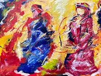 Modern, kleurrijk acrylverf schilderij met twee geabstraheerde figuren die je fantasie prikkelen.