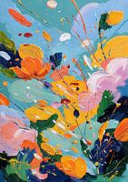 Dit abstract expressionistische schilderij toont bloemen in felle kleuren en dynamische penseelstreken tegen een helderblauwe achtergrond. Fel oranje, roze, geel, turquoise, wit en groen zorgen voor levendige contrasten, terwijl kleine bloemblaadjes de ruimte in lijken te vliegen en beweging in de compositie brengen. Het werk is geïnspireerd door het fauvisme en straalt vreugde, energie en speelse lichtheid uit. Het expressieve kleurenpalet en de gedurfde vormen creëren een emotioneel, boeiend effect. Ideaal als kunstdruk of poster voor liefhebbers van kleurrijke, dynamische abstractie en fauve-geïnspireerde kunst die leven en vrolijkheid brengt in elke kamer.