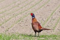 Fazant loopt in het voorjaar langs een akker in het Noorden van Holland / Fasan geht im Frühjahr auf einem Feld im Norden Hollands spazieren