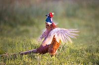 Vlak bij de Poelboerderij in Wormer trof ik deze fazant. Hij moest zich goed laten gelden. Hij ging opeens steil recht overeind staan, gooide zijn snavel wijd open en liet zijn scherpe geluid over het veld weerklinken. Daarbij klapten de vleugels van de haan zo wijd mogelijk open en sloeg hij er een aantal keren mee naar voren.