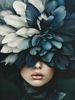 Een abstract schilderij van een vrouw bedekt met witte en donkerblauwe veren.