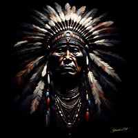 Dit opvallende portret toont een indiaans opperhoofd getooid met een uitgebreide gevederde hoofdtooi, weergegeven met uitzonderlijke details en eerbied. De hoofdtooi steekt prominent omhoog, elke veer zorgvuldig gedefinieerd, met een harmonie van levendige kleuren die eer, leiderschap en voorouderlijk erfgoed symboliseren. Tegen de…