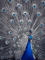 Onze blauwe Pauw pronkt met zijn staartveren. Een lijnenspel met prachtige ogen