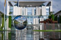 De Bondskanselarij na een regenbui, gefotografeerd door een lensbal.