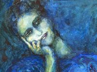 Portret / Vrouw / Aquarel / Schilderkunst / Blauw / Denken / Nadenken / Gedachte / Ogen / Kijken / Mond / Glimlach / Gevoel / Overpeinzen / Arm / Handen / Steunen / Zitten / Blauwe trui / Blauwe achtergrond / Kleine uitsnede