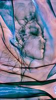 Een werk van textiel in meerdere lagen, er is gebruik gemaakt van zwart draad, glanzend wil draad, houtskool, transparante doeken & vulling.