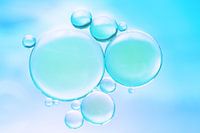 Een opname van dichtbij van oliedruppels op water in een blauwe setting.