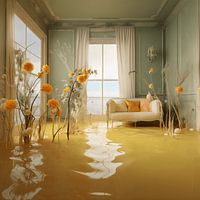 In de kamer bloeien bloemen in al hun weelderige pracht maar temidden van deze bloemenpracht een beeld van een ondergelopen kamer. De zee stijgt hoger en hoger tot het binnen onze huizen komt.