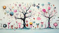 Centraal staan twee bomen, uitbundig versierd met bloemen, vruchten en verscheidene fantasierijke figuren die zweven en dansen tussen de takken en bladeren. Deze figuren, variërend van rond en pluizig tot lang en slank, lijken elk hun eigen persoonlijkheid en verhaal te hebben. Hun grote, expressieve ogen voegen een menselijke touch toe aan het tafereel, waardoor de kijker een connectie kan maken met deze ongewone wezens. De achtergrond is een canvas van pasteltinten, wat zorgt voor een dromerige sfeer.