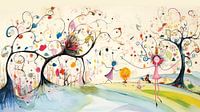 Het stelt een reeks grillige bomen voor, met kronkelende takken die een overvloed aan kleurrijke bladeren, harten, sterren en muzieknoten dragen. Tussen de bomen door dansen enkele vrolijk gekleurde figuren die lijken te zijn ontsnapt uit een sprookjesboek. Hun lichamen zijn lang en dun, met overdreven proporties die bijdragen aan het surrealistische gevoel van de scène. Aan de voet van de bomen is een zacht, glooiend landschap te zien, geschilderd in zachte pasteltinten die de droomachtige sfeer versterken.