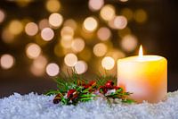 Koop de foto Feestelijk brandend kerstkaarslicht op sneeuw van Alex Winter op canvas, aluminium dibond, (ingelijste) fotoprint, behang en ArtFrame, op maat geprint in Fine-Art kwaliteit.