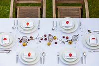 Herfsttafel met kastanjes in de tuin in Duitsland.