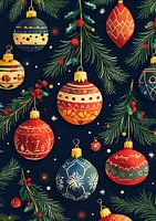 Feestelijke Ballen en Dennengroen - Dit kerst schilderij toont een verscheidenheid aan kleurrijke, gedetailleerde kerstballen hangend aan donkergroene dennentakken tegen een diepblauwe achtergrond, versierd met kleine witte stippen die sneeuw voorstellen.
