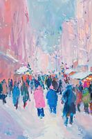 Feestelijke Markt - Dit winterlandschap schilderij toont een levendige, kleurrijke menigte mensen die zich verzamelen op een besneeuwde markt, omgeven door bomen en gebouwen in zachte pasteltinten, waardoor een gevoel van feestelijke drukte en koude wintertijd wordt opgeroepen.