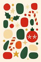 Dit kunstwerk is een speelse en moderne herinterpretatie van klassieke kerstsymbolen, gerangschikt als een levendige compositie van zachte geometrische vormen. Op het eerste gezicht zie je bekende kerstelementen - hulstbladeren met gouden bessen, gestreepte zuurstokken, felrode ornamenten en kleine stervormige motieven verspreid over…