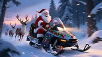 De Kerstman suist voorbij in een fonkelende sneeuwstorm, zittend op een liefdevol versierde sneeuwscooter die eruitziet als een kleine feestelijke praalwagen. Zijn rode jas waait in de wind, de witte bontrand steekt fel af tegen de winterse lucht; de puntmuts wappert vrolijk achter hem aan. De sneeuwscooter is versierd met feeërieke lichtjes, dennentakken en glimmende kerstballen, op de zijkant prijkt een gouden ster en achter het zadel bungelt een kleine slinger van klatergoud. De motor spint laag en warm, terwijl poedersneeuw in fijne vlokjes wordt opgewerveld en in glinsterende wolken achter het voertuig verdwijnt.