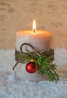 Feestelijke kerstkaars op sneeuw versierd met groene twijg van Alex Winter