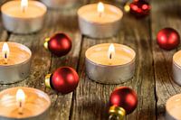 Feestelijke Kerststemming met kaarsen en rode kerstballendecoratie, Kerstkaart