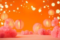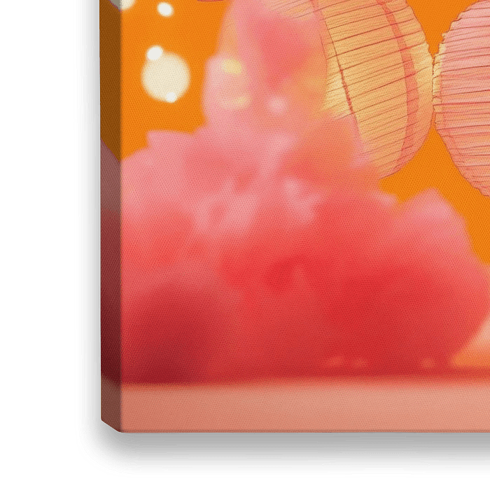 Een betoverend samenspel van zachte roze tinten en warm oranje neemt de kijker mee naar een droomachtige wereld. Gloeiende lantaarns en pluizige pompons stralen een feestelijke sfeer uit die lichtheid en vreugde belooft. Perfect voor de woonkamer, waar ze een gezellige sfeer creëren en uitnodigende gesprekken stimuleren.