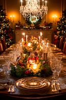 Een feestelijk gedekte tafel schittert in het warme licht van kaarsen en een glinsterende kroonluchter. Weelderige borden en sprankelend kristallen servies nodigen uit om feestelijke gelegenheden te vieren. Omringd door kerstdecoraties en mooie details straalt de setting een gevoel van elegantie en gezelligheid uit, perfect voor een…