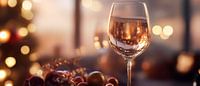 Een sprankelend glas wijn tegen een vage, feestelijke achtergrond, omringd door heerlijke druiven en zacht licht, nodigt uit om te ontspannen. Deze sfeer van plezier en gezelligheid maakt het schilderij perfect voor de woonkamer, waar het gezellige momenten en feestelijke gelegenheden prachtig aanvult.