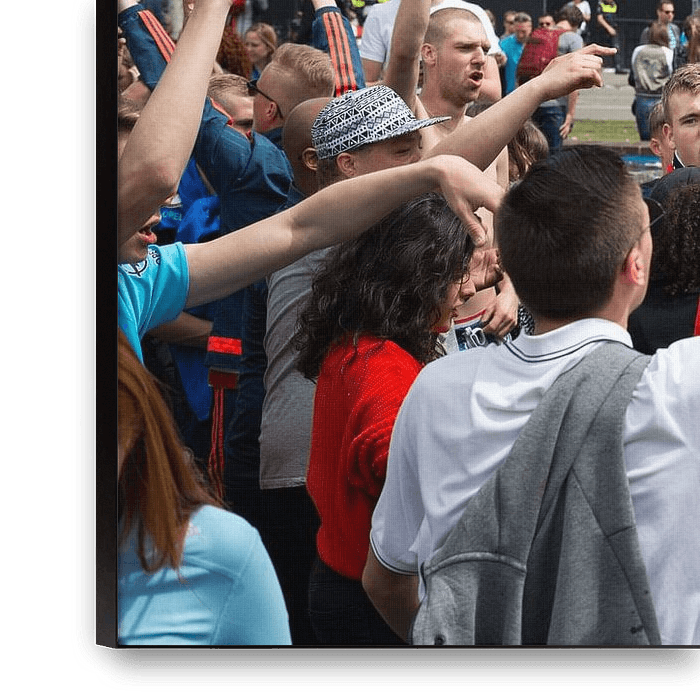 Iedereen viert het kampioenschap van Feijenoord. Hier zie je een kleine jongen op de schouders van fans. Het gewordt uiteraard gevierd in de fontein.