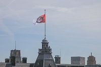 Feijenoord vlag op het Stadhuis tijdens de huldiging op de Coolsingel. Dit werk is onderdeel van de fotocollectie van MS Fotografie. Klik rechts op "Alle werken" om meer werken uit de collectie te zien.