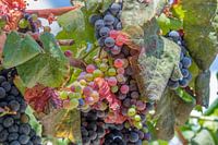 Wijnrank met mooie felgekleurde trossen druiven in verschillende felle kleuren in een wijngaard in het midden van Portugal.