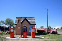 We vonden een paar gerestaureerde fel oranje Phillips 66 benzinepompen in het stadje McLean, Texas, USA. Echt een prachtig tafereel, vooral met de oude truck die ernaast geparkeerd stond.