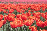 Fel oranje tulpen met een strook roze tulpen op de achtergrond met mooi groen blad. Landbouw op zijn mooist in Nederland.
