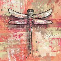 Deze libelle is digitaal geschilderd in knallende kleuren. Fel rood roze oranje en gele tinten met een zwarte omlijning. Dit werk is gebaseerd op een handgetekende potlood schets. De felle herfst kleuren spatten van het doek. Dit modern kunstwerk heeft een unieke stijl. Door in photoshop talloze lagen met elkaar te combineren ontstaat er een gelaagd kunstwerk vol met details.