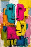 Felgekleurde gezichten - Dit abstract schilderij toont drie kleurrijke gezichten in felle tinten zoals blauw, roze en geel, met een speelse benadering van expressie en vormen, wat een levendige sfeer creëert in moderne kunst.