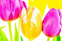 De gele tulp combineert goed door de subtiele paarsige randjes die aan de bladeren zitten. Het hele beeld straalt rust uit en daarom kan deze foto gebruikt worden voor zowel een werkomgeving als b.v. een wachtruimte. Ook in een grote hal misstaat de foto niet, maar dan zou ik kiezen voor een fors formaat.