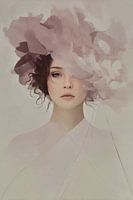 Een digitale illustratie waarin een etherische vrouwenportret opgaat in een wolk van zachte roze en paarse bloemvormige vormen. Met minimale details en poëtische abstractie creëert het werk een introspectieve sfeer waarin realiteit en fantasie versmelten. De vloeide vormen rond het gezicht suggereren gedachten, gevoelens en innerlijke…
