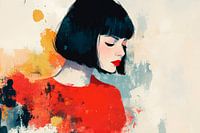 Zachte tinten en expressieve kleuren omlijsten een mysterieuze vrouw in een gewaagde rode jurk. Haar bedachtzame uitdrukking en de harmonieuze, abstracte kleuren trekken de kijker mee in een wereld van emoties. Dit kunstwerk past perfect in de woonkamer, waar het aanzet tot nadenken en dromen.