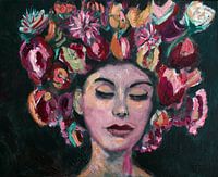 Abstract en kleurrijk schilderij van een portret van een vrouw. Veel bloemen en kleuren zijn op dit moment de trend.
