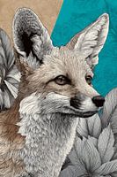 Deze betoverende illustratie toont een fennek, de woestijnvos met zijn iconisch grote oren, in een grafisch gelaagd kunstwerk dat flora en fauna harmonieus samenbrengt. De gedetailleerde lijnvoering van de vacht contrasteert subtiel met het decor van abstracte bladeren en een kleurrijk geometrisch vlak in turquoise en zandtinten. De…