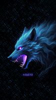 Etherische blauwe wolf met gloeiende paarse ogen, huilend tegen een achtergrond van oude Noorse runen. Een spookachtig beeld van mystieke kracht en diepe schaduwen.
