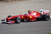 Fernando Alsono in de Ferrari tijdens de Formule 1 grand prix van Italie, op het Autodromo Nazionale di Monza, bij het uitkomen van de Prima Variante (eerste chicane)