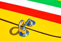 Klassieke Ferrari 250 GT motorklepvergrendeling uit de jaren 1960 in chroom op een felgele motorkap met een Italiaanse vlag.