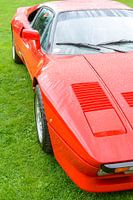 Ferrari 288 GTO raceauto uit de jaren 80 in Ferrari rood. De Ferrari GTO is gebouwd om deel te nemen aan de nieuwe Group B Race-serie. De GTO presteerde indrukwekkend, met 0-60 mph keer rond de 5 seconden en een topsnelheid van 189 mph (304 km / h), waardoor het de eerste straat legale productieauto is die 300 km / u haalt. De auto is te zien tijdens het 2017 Classic Days-evenement op Schloss Dyck. Mensen op de achtergrond kijken naar de auto's.
