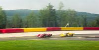 Twee legendarische en bijzondere klassiekers van Ferrari, racend tegen elkaar; de 312P en de 512M in actie op Spa-Francorchamps. De kleur van de auto's matcht goed met de banden (rood en geel) op de achtergrond, en ik heb gebruik gemaakt van een trage sluitertijd om de beweging in de foto vast te leggen.