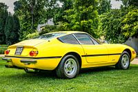 Felgele Ferrari 365 GTB/4 Daytona Italiaanse sportwagen uit de jaren zeventig. De 365 GTB/4 is een tweezits grand tourer die van 1968 tot 1973 werd geproduceerd door Ferrari. De bijnaam Daytona kwam van Ferrari's 1-2-3 finish in de 24 uur van Daytona in februari 1967. De Daytona is uitgerust met een 4,4-liter V12-motor die 352 pk levert. De motor is voorin gemonteerd, in tegenstelling tot veel andere Ferrari's uit die tijd, die vaak een middenmotor hadden. Hij kan een topsnelheid bereiken van 280 km/u en is daarmee een van de snelste wegauto's uit die tijd. De acceleratie van 0 naar 60 km/u duurt ongeveer 5,4 seconden. Het ontwerp van de auto heeft een lange motorkap en een fastback-stijl, met een prominente "shark-nose" voorkant. Het ontwerp is van Leonardo Fioravanti van Pininfarina en laat de klassieke Italiaanse styling zien.