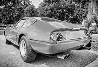 Ferrari 365 GTB/4 Daytona 1970's klassieke sportwagen in zwart en wit. De Ferrari 365 GTB/4, bijgenaamd Ferrari Daytona vanwege zijn succes op het circuit van Daytona, is een tweezits grand tourer met V12-motor van Ferrari van 1968 tot 1973.
