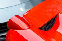 Rode Ferrari 458 Italia sportwagen achterlichte detail met een F12Berlinetta in de achtergrond. De 458 Italia wordt aangedreven door een 4.499 CC V8 motor met 562 PK. De sportwagen accelereert van 0-100 km/u 2.9?3.0 secondes en heeft een topsnelheid van 340 km/u.