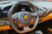 Stuurwiel met knoppen en flappy paddle gear shift op een Ferrari 488 Spider convertible sportwagen. De 488 Spider is de open versie van de Ferrari 488 GTB V8 sportwagen met een intrekbare hardtop.