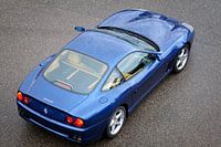 Blauwe Ferrari 550 Maranello GT sportwagen van boven gezien. De Ferrari 550 Maranello (tipo F133) is uitgerust met een V12 motor en is een 2-zits grand tourer.